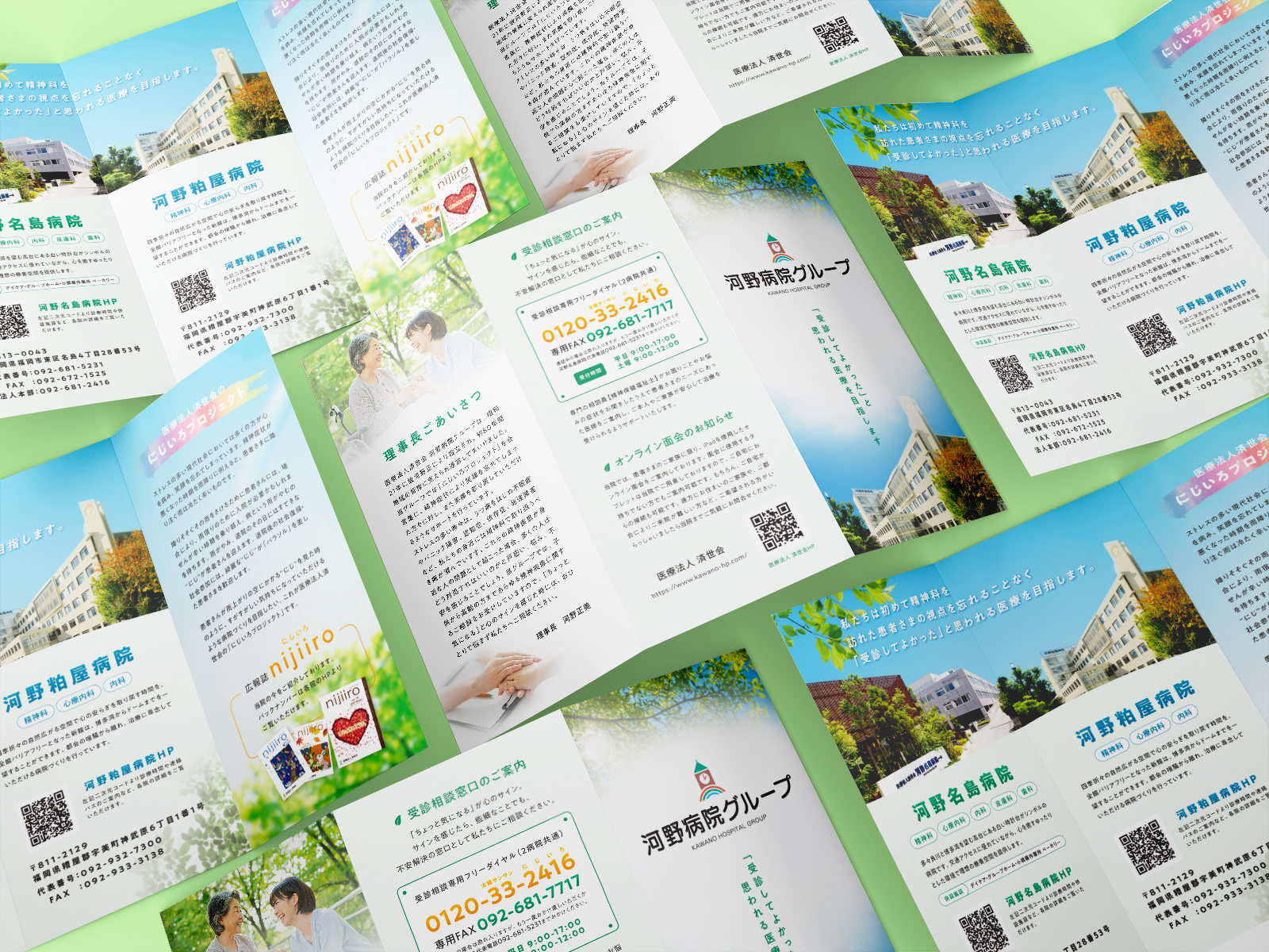 精神科医療への安心感と温かさを、グリーン・ブルーを基調とした柔らかな色彩と明るいトーンで表現しました。医療法人済世会さまが取り組む「にじいろプロジェクト」と連動し、希望をイメージさせる要素を加え、患者さまと医療従事者の穏やかな写真で親しみやすさを演出し、患者さまの社会復帰を支援する理念が伝わるようデザインしました。