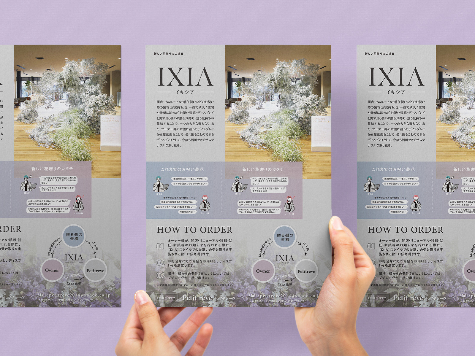 富山市でフラワーデザインを行っているPetit reveさまよりご依頼をいただき、サービス紹介チラシを制作させていただきました。